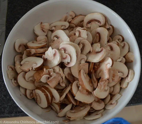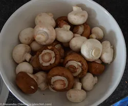 The peppers are gonna leave a lot of tasty juice and become smaller and smaller, making room for the mushrooms. Oh, about those mushrooms, now you have some time to cut them off, ruthless but necessary.