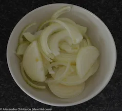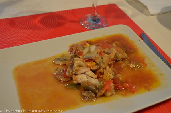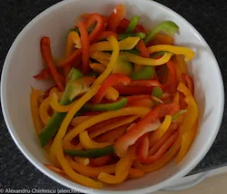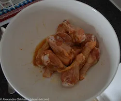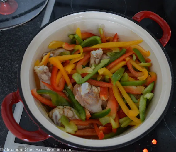 But let’s pretend that this is not the case. So wash the chicken and add spices and let it have a good time with the spices until its time comes. Cut the onion and the peppers. Add some oil in a pot which is big enough to hold all this together[2] and put it on the burner.