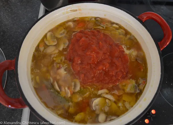 When the time comes, put the mushrooms on top, stir everything and let ‘em suffer some more. Prepare the garlic cloves, it will be crushing time in a minute (figurative minute, actually it would be more like 20 minutes). In 10 minutes add the peeled tomatoes and stir again very well.