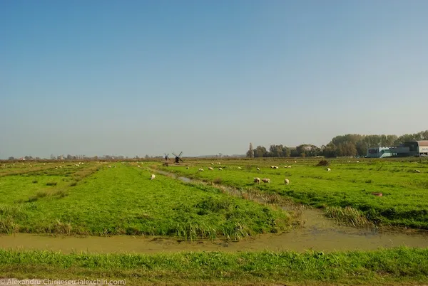 A view from the countryside near the Zaanse Schans, a park known for its functional wind mills and traditional Dutch landscapes.