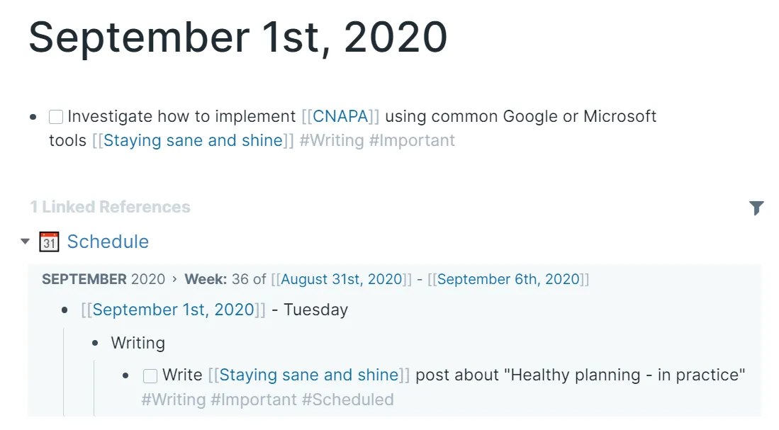 Because every day in the Schedule page is a Roam page link, it will show in the Daily Notes page for that day. When I visit my Roam homepage, I will be able to easily see what blocks I have scheduled and what items for each. I still need the calendar to see at what time the blocks are scheduled, and then I have Roam to tell me what I scheduled.