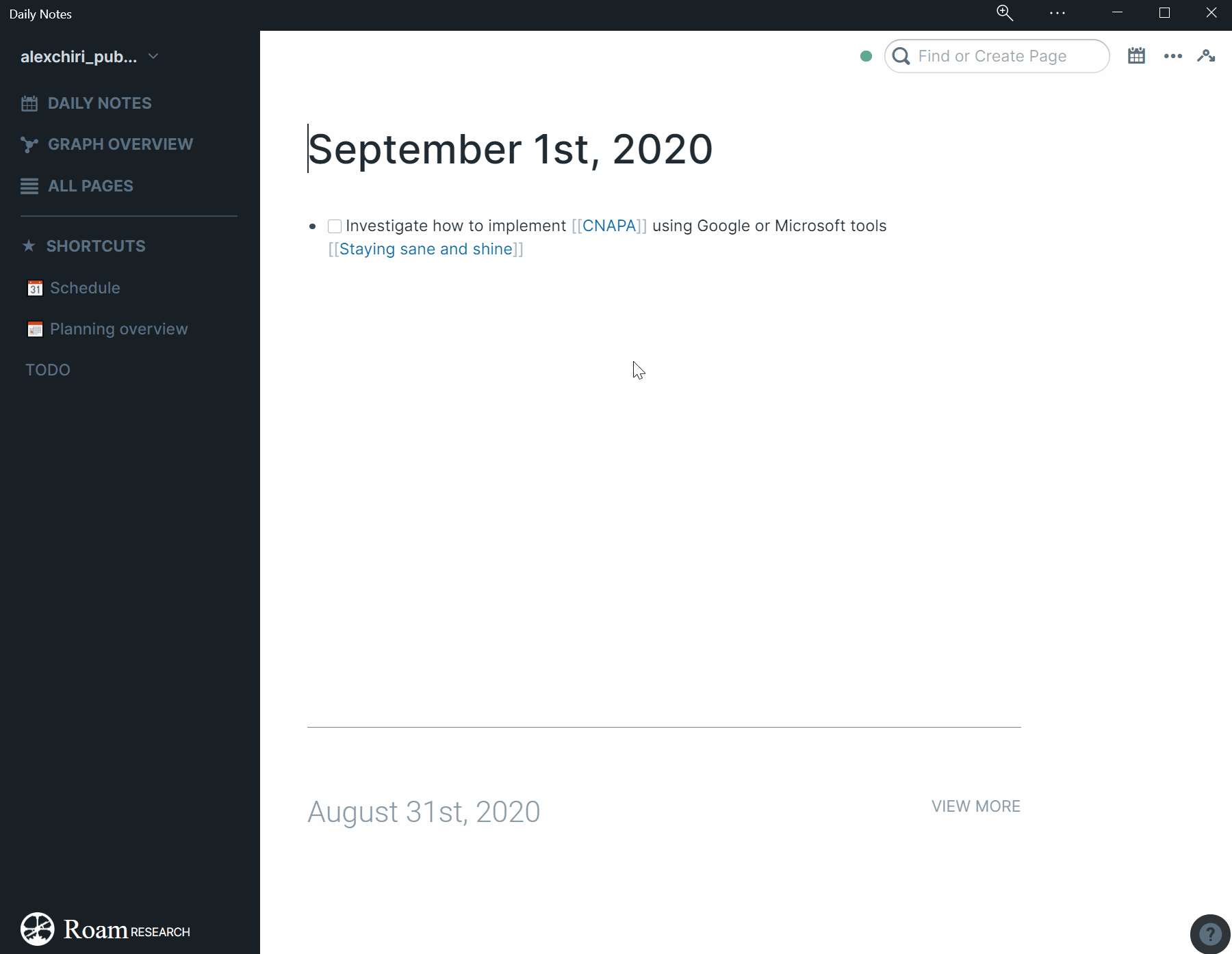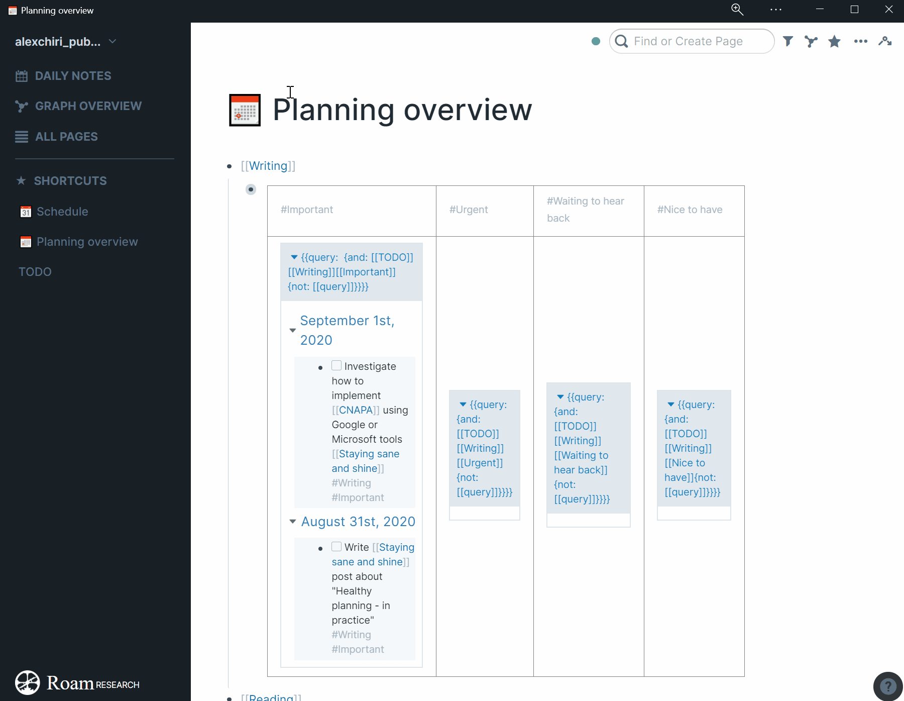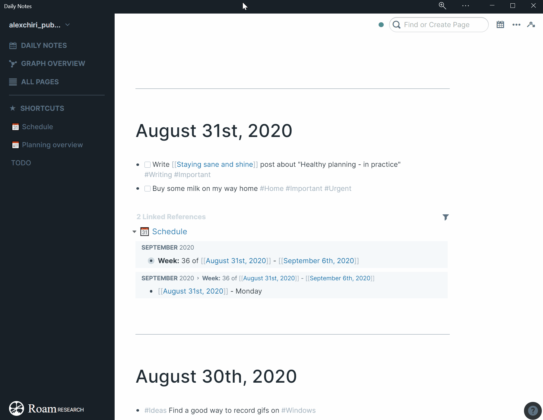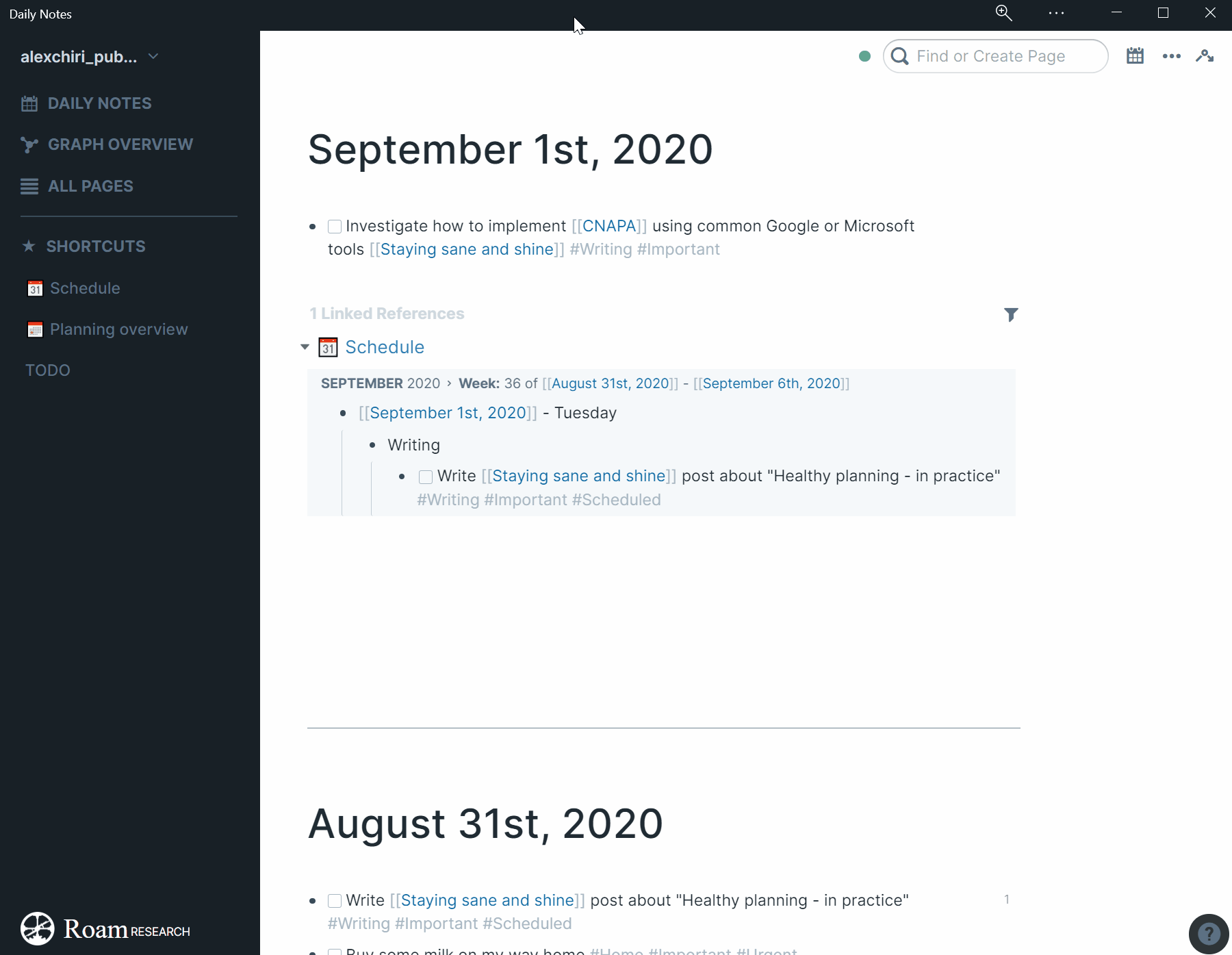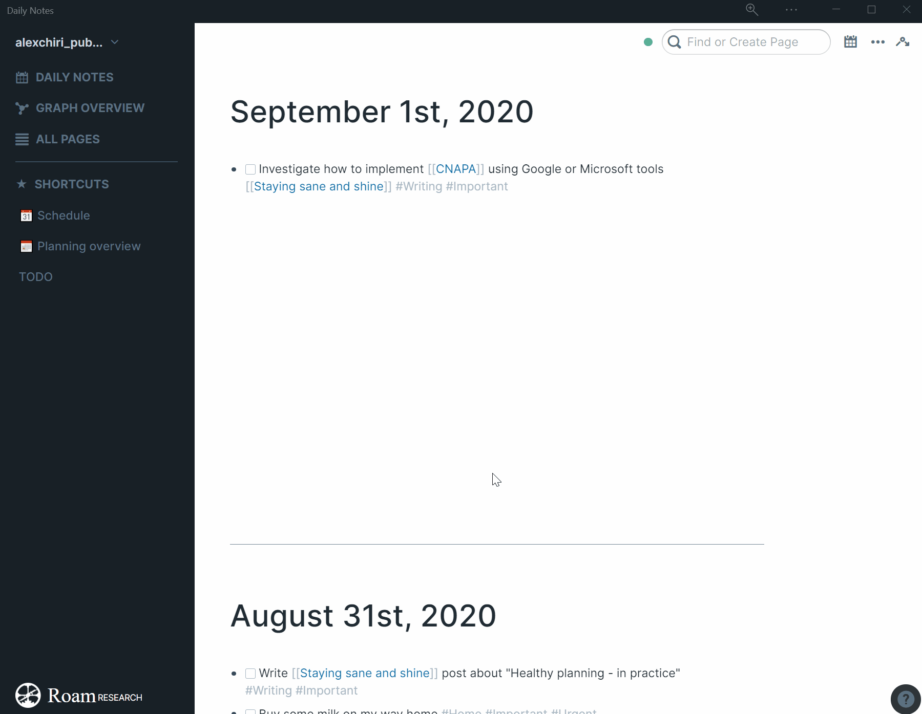 Long story short, I use the Daily Notes as my Inbox. Whenever there is something I want to write down for later, I open my phone or my computer, go to Roam and put it down in the page of that day. I might tag or I might not, but if it’s something I need to act on sometime in the future, I will mark it as a TODO.