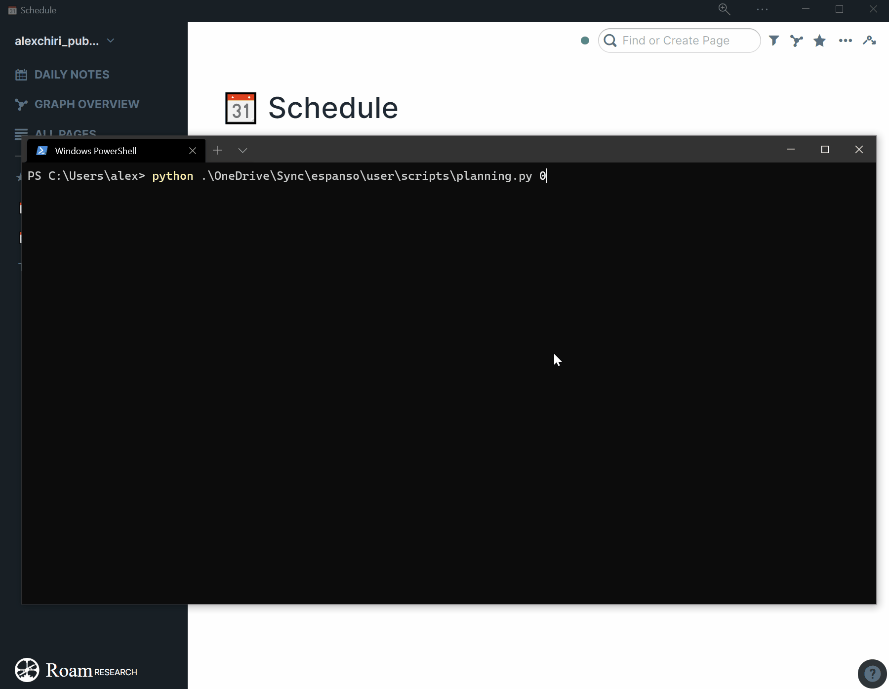 I also use Roam to associate TODO items with blocks. I have a small Python script that I run every time I do Configure and Control (weekly) and this script generates a small template with the number of the week and a block for each day under. I generate this every week and I paste it in a page I created in Roam called Schedule.