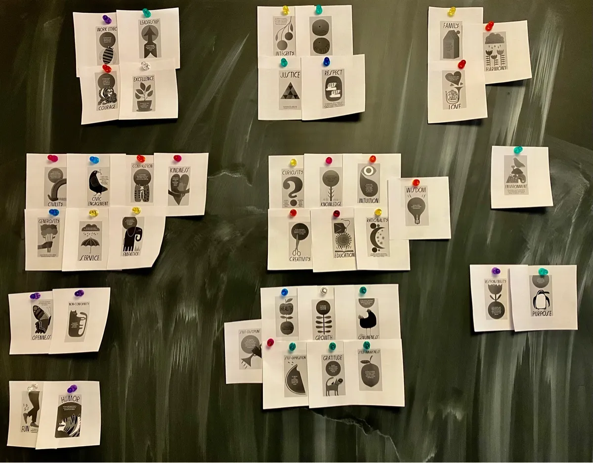 This is an exercise I tried to do several times in the past, but without really finalizing it. Biggest problem was that I found it quite hard to narrow down the list. This time, I will try something different. I made a cheap copy of the amazing Live Your Values card deck that is smaller to fit my board and I filtered the values to include all that resonate most with me at this point. This was a very generous selection, instead of struggling to reduce the number of the values, I did exactly the opposite (which was way more satisfying).