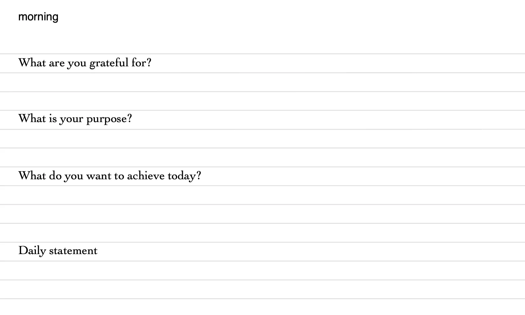 A complementary practice to meditation is journaling. I found it very hard to spend more than 30 mins a day for writing in a journal, so I tried to contain it to that time. I started from the 5 minute journal format, but I adjusted it a bit. Here’s what I do: