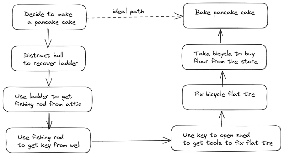One of these stories is about Findus’ birthday and Pettson making him a pancake cake. After going through it for the umpteenth time, it struck me that it resembles a pattern I’ve seen in engineering teams with a lot of technical debt. I will explain, take a look at the the diagram below which represents the path Pettson and Findus need to take in order to make the cake: